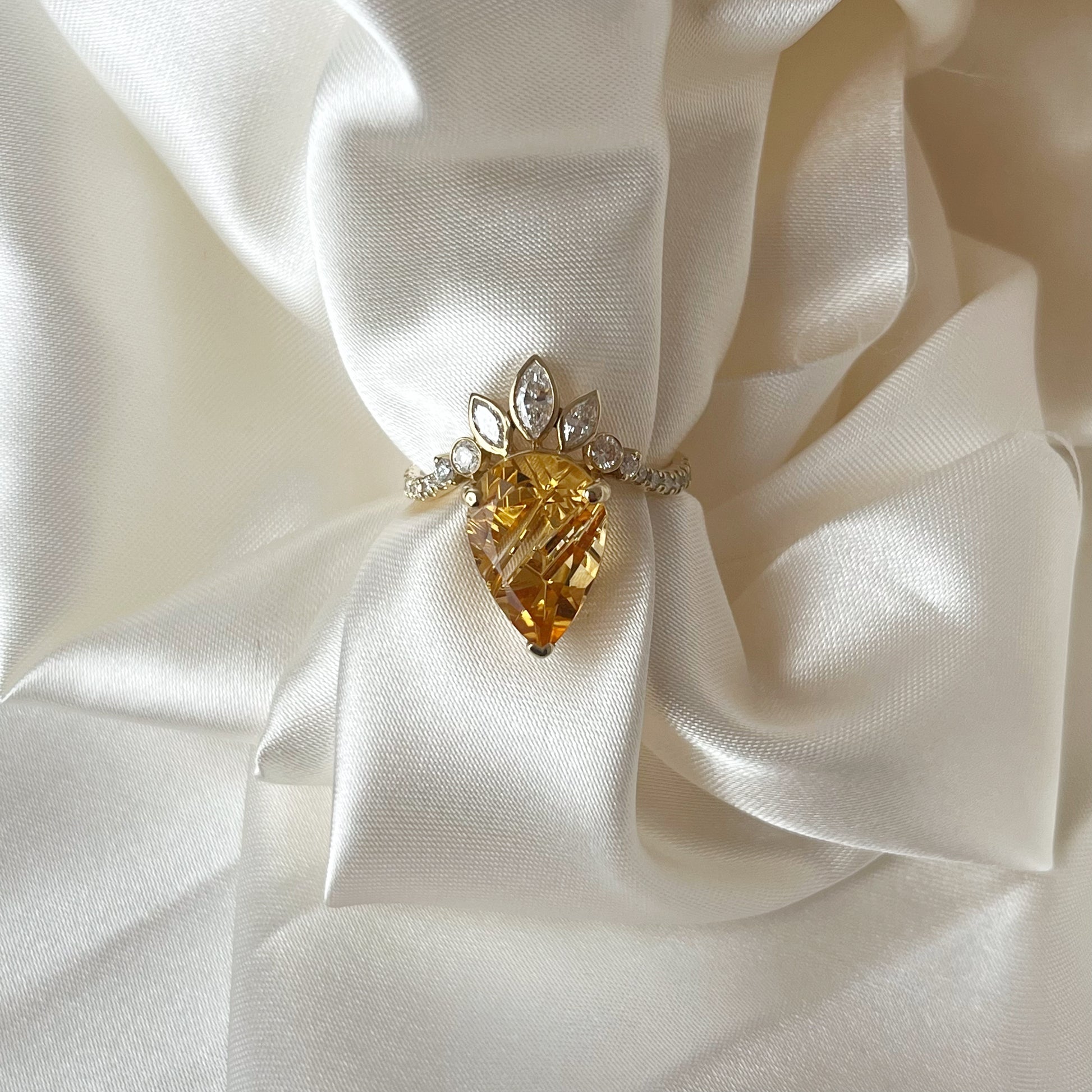 - Set in 14k yellow gold with bezel set marquise diamond chevron accent and round diamond side accents and